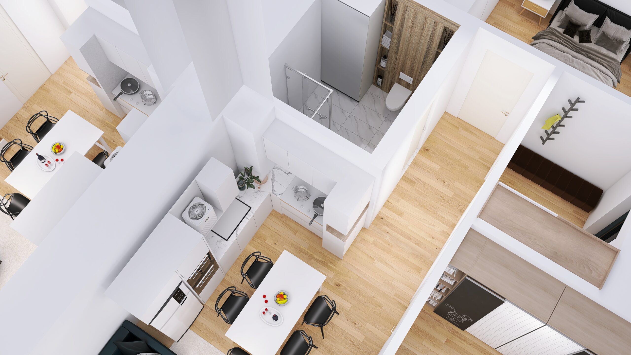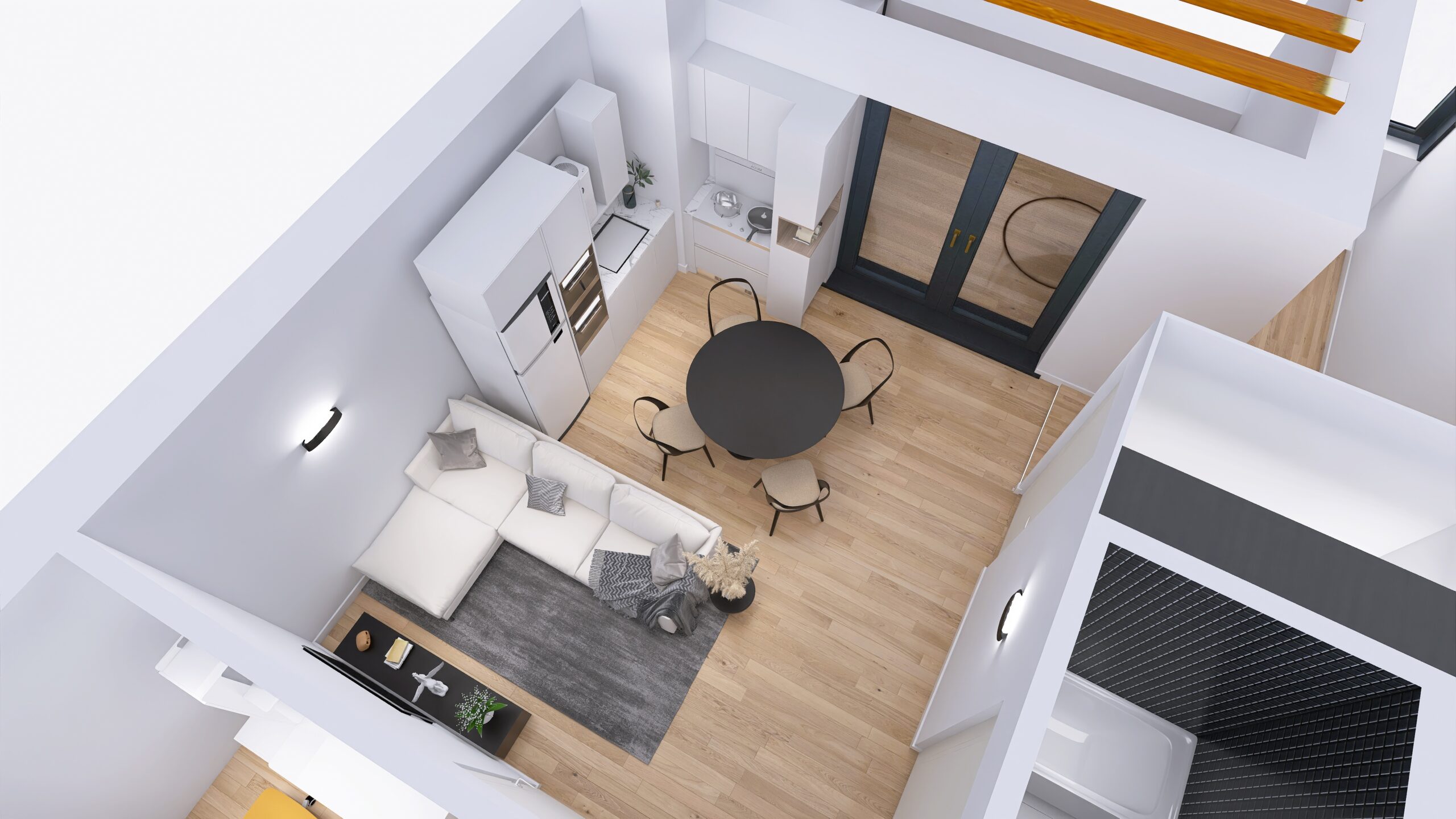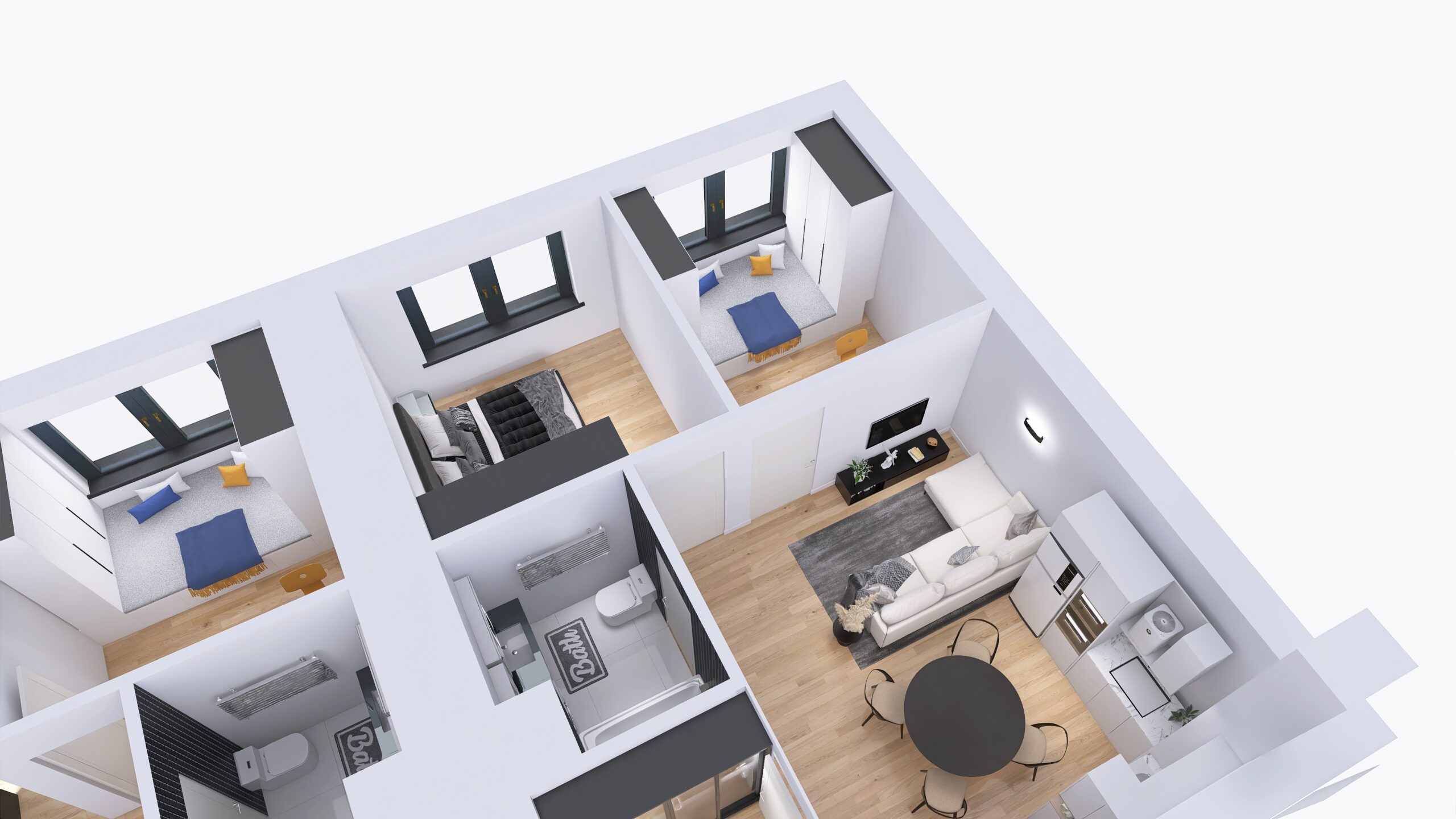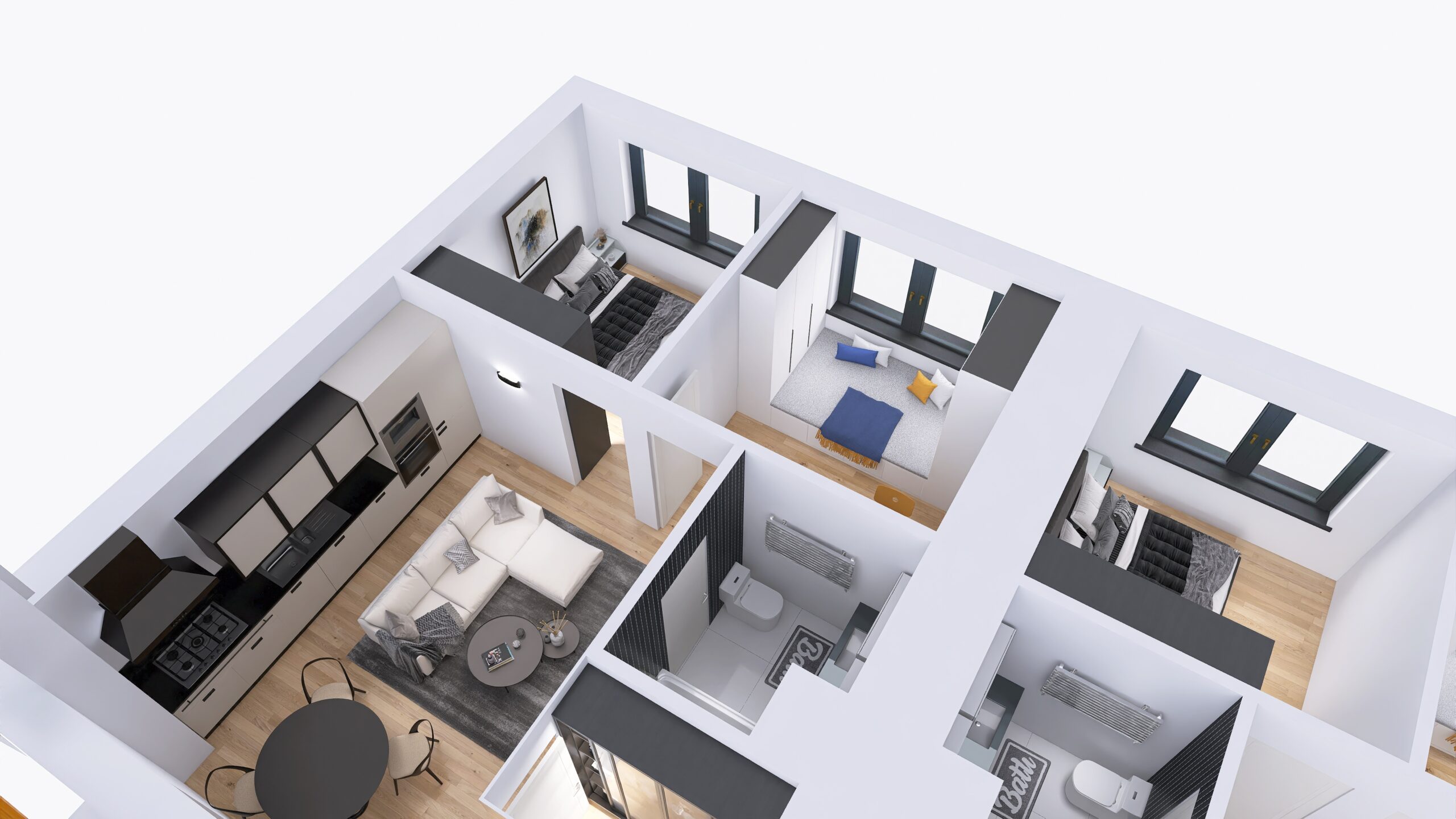 Każde z czterech mieszkań zostało zaprojektowane z uwzględnieniem optymalnego wykorzystania przestrzeni. Duże okna zapewniają doskonałe doświetlenie wnętrz oraz przyjemny widok na okolicę. Nowoczesne rozwiązania architektoniczne gwarantują komfort akustyczny i prywatność mieszkańców.