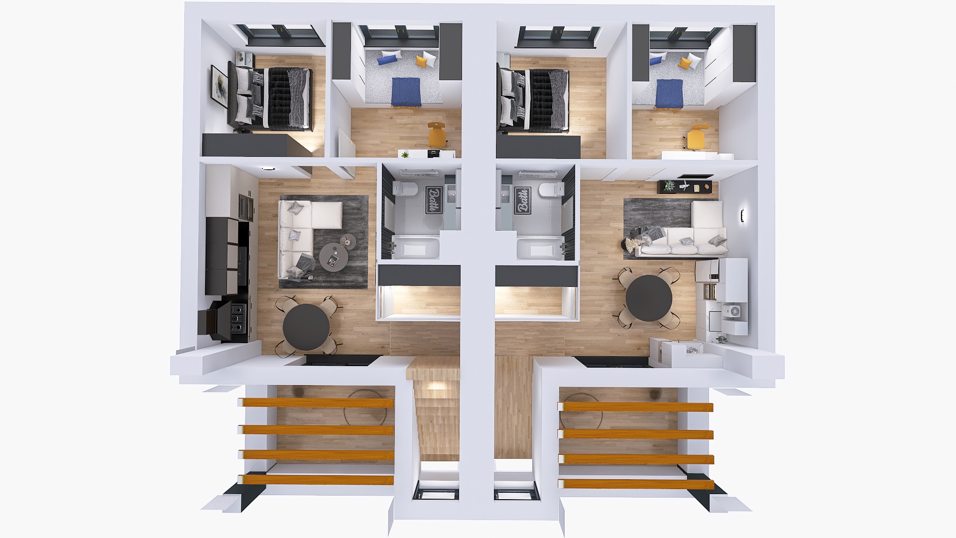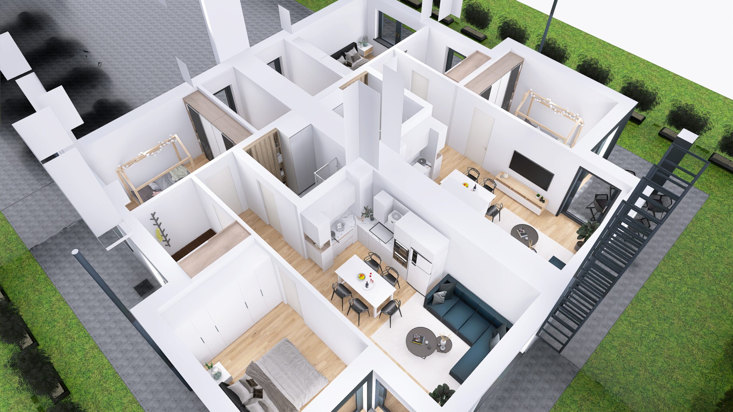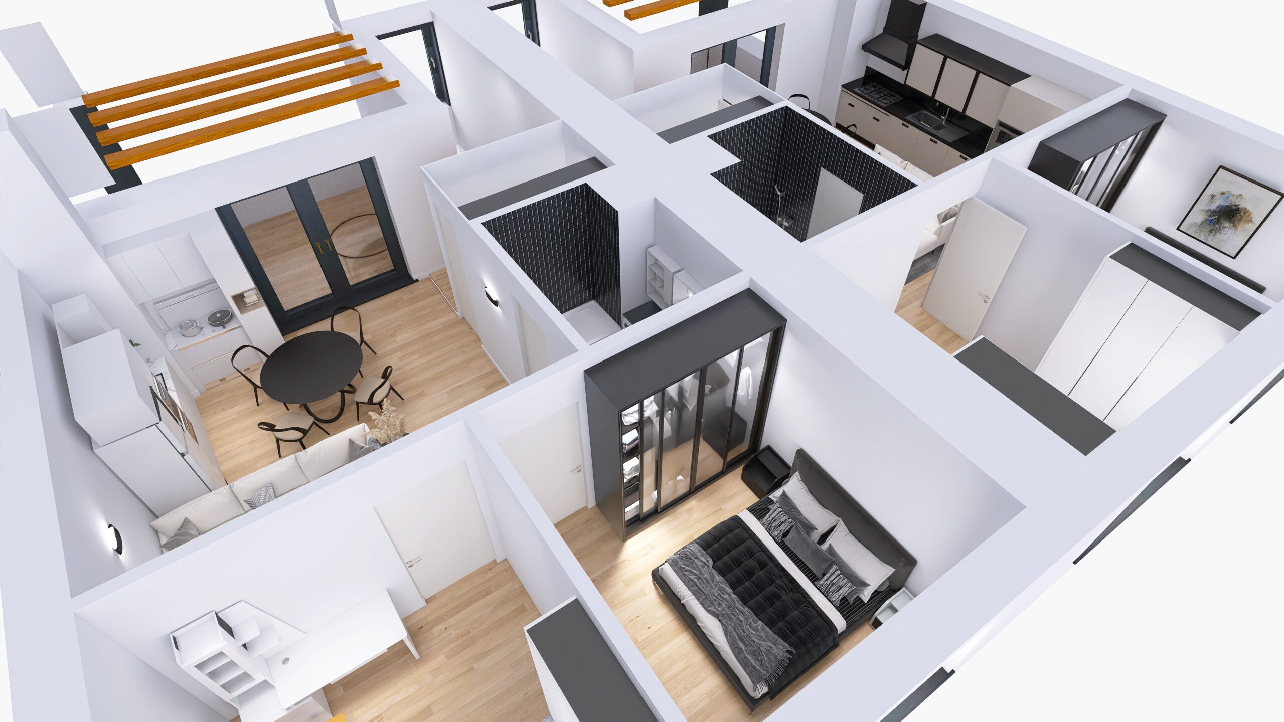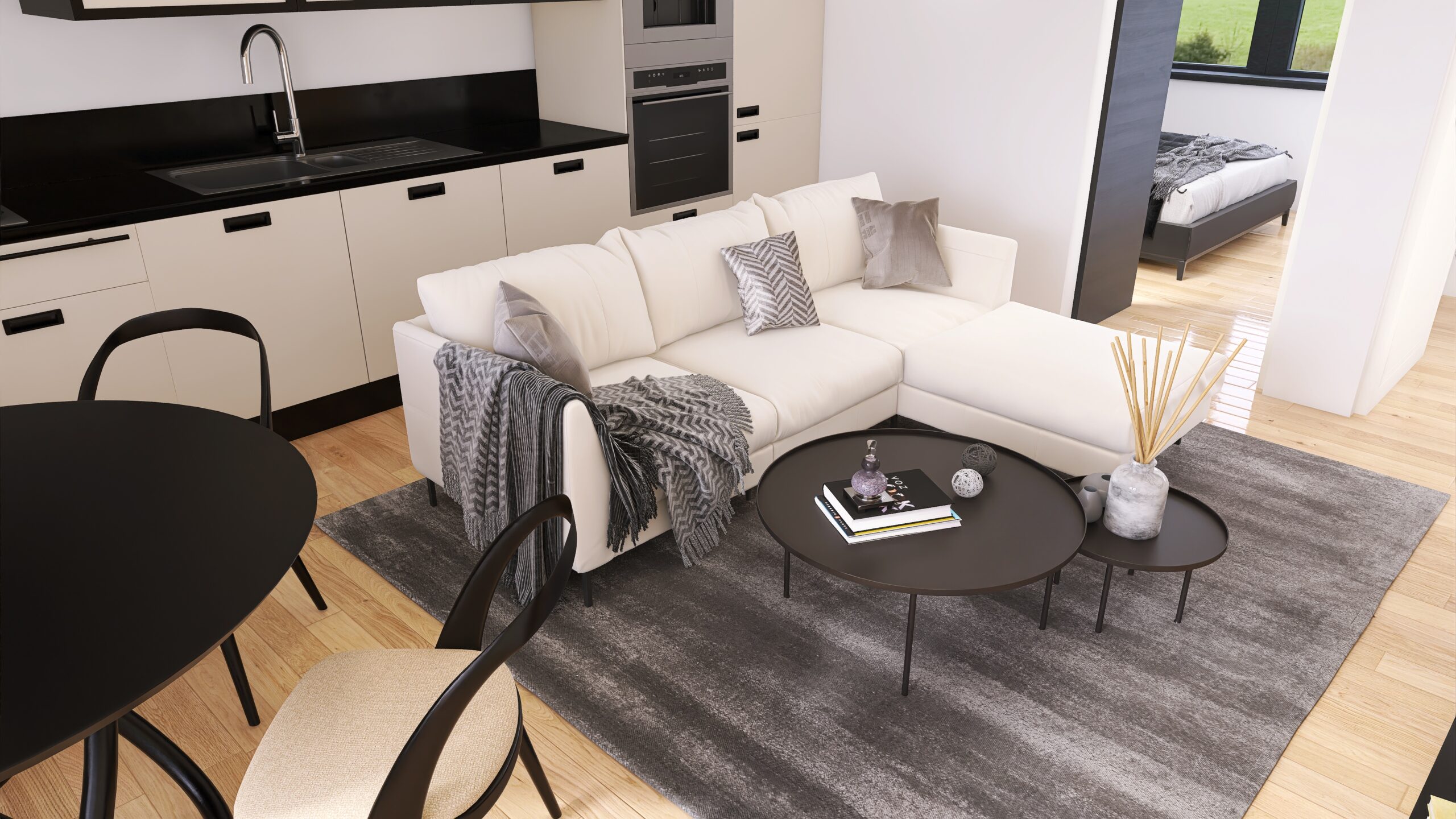 Każde z czterech mieszkań zostało zaprojektowane z uwzględnieniem optymalnego wykorzystania przestrzeni. Duże okna zapewniają doskonałe doświetlenie wnętrz oraz przyjemny widok na okolicę. Nowoczesne rozwiązania architektoniczne gwarantują komfort akustyczny i prywatność mieszkańców.